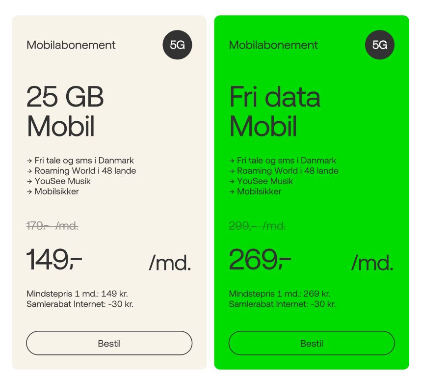 Her er to udvalgte abonnementer som fx kan vælges. Og har du allerede internet sparer du 30 kr./md. uanset hvilket abonnement, som vælges.